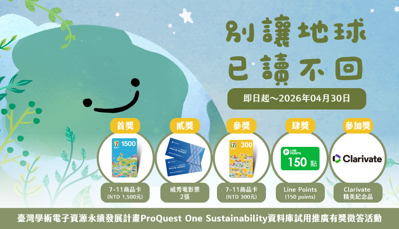 【推廣活動】ProQuest One Sustainability 資料庫試用暨有獎徵答活動,歡迎參加 ! (4/30止)